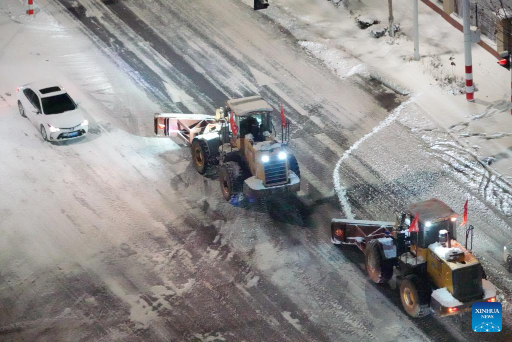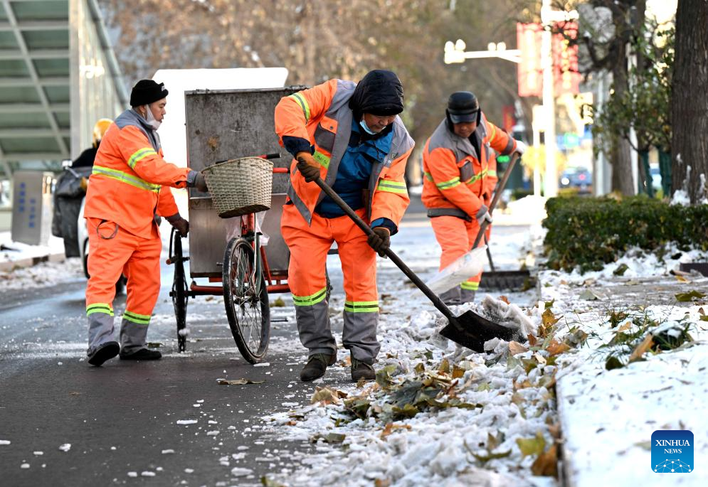 Sanitation workers clear snow in the street in Shijiazhuang, north China's Hebei Province, Dec. 17, 2023. Countermeasures have been taken to prevent or alleviate impacts inflicted by extensive snowfall and other freezing conditions. (Photo by Chen Qibao/Xinhua)