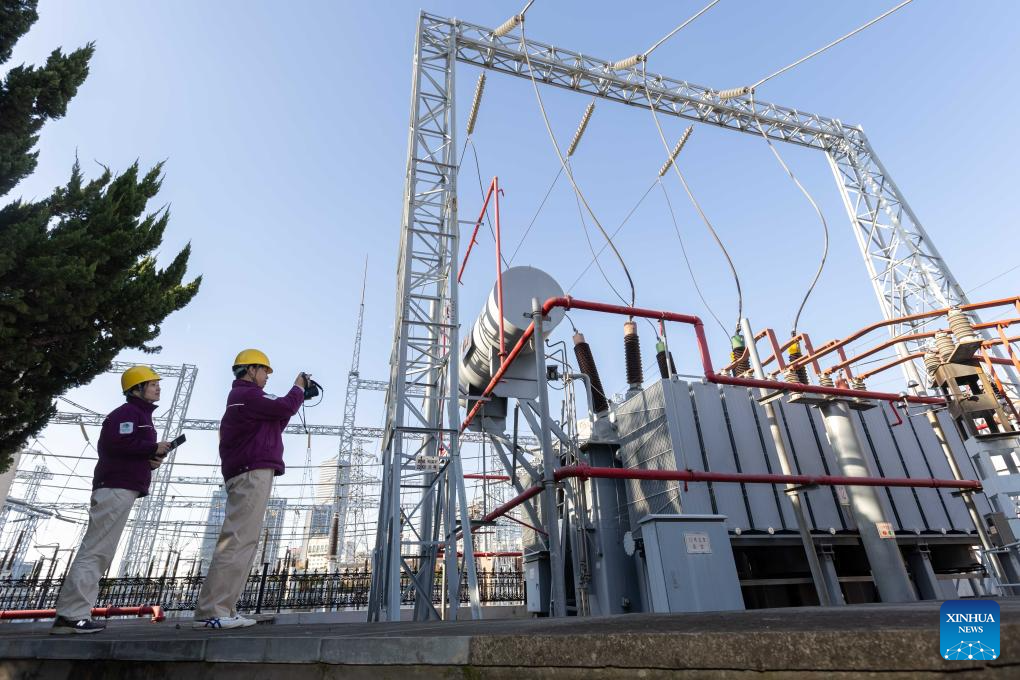 Staff workers of power supply company carry out infrared temperature measurement of the main transformer in east China's Shanghai, Dec. 17, 2023. Countermeasures have been taken to prevent or alleviate impacts inflicted by extensive snowfall and other freezing conditions. (Xinhua/Wang Xiang)