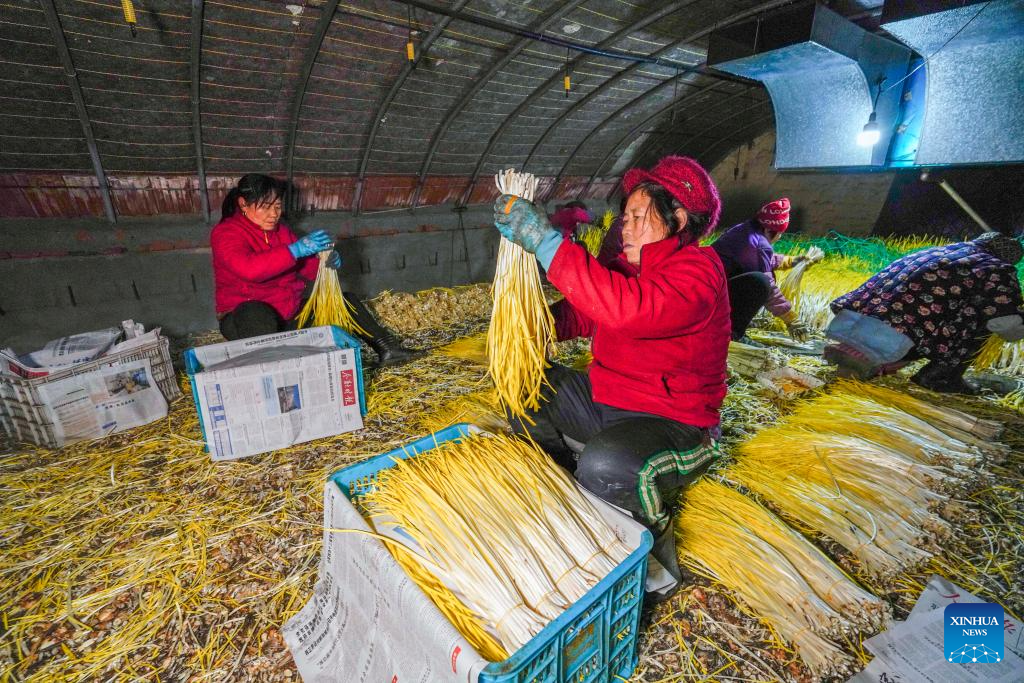Farmers package blanched garlic leaves in Liuxicun Township in Zunhua, north China's Hebei Province, Dec. 17, 2023. Countermeasures have been taken to prevent or alleviate impacts inflicted by extensive snowfall and other freezing conditions. (Photo by Liu Mancang/Xinhua)