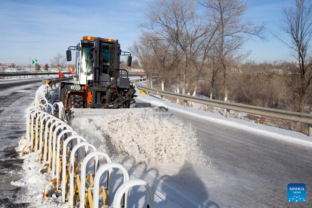 Staff members clear snow in the expressway in Wuwei City, northwest China's Gansu Province, Dec. 16, 2023. Countermeasures have been taken to prevent or alleviate impacts inflicted by extensive snowfall and other freezing conditions. (Photo by Jiang Aiping/Xinhua)