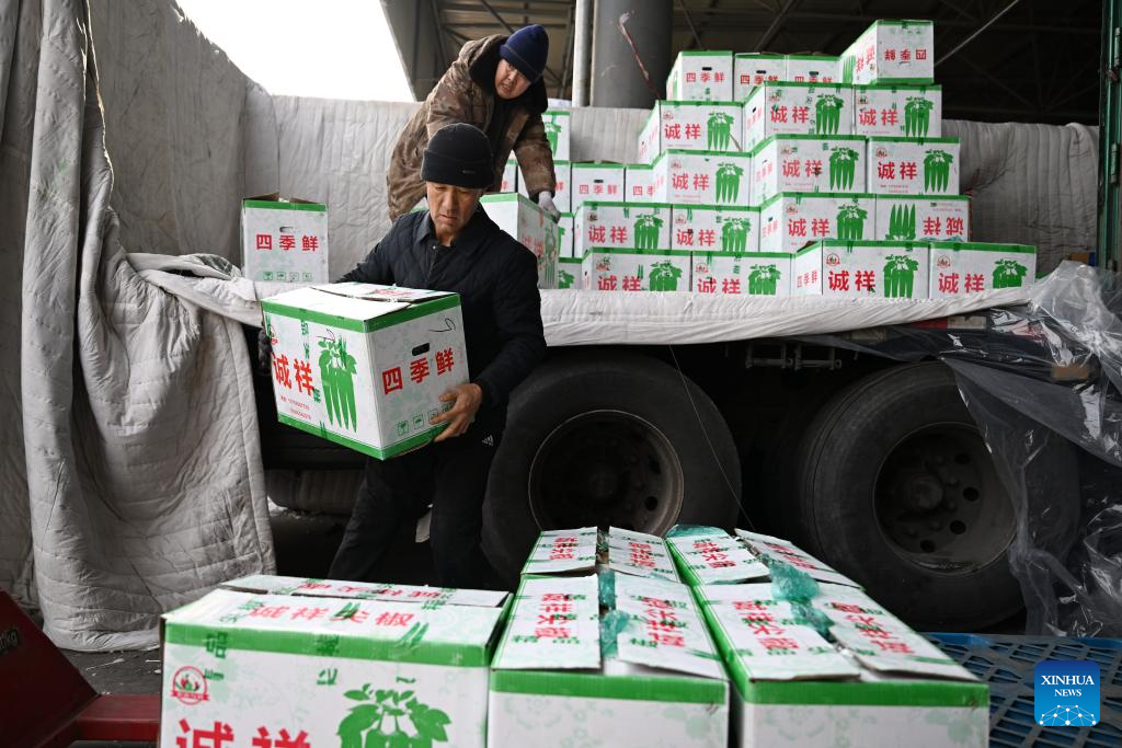 Farmers carry vegetables at a greenhouse in Longyao County, north China's Hebei Province, Dec. 17, 2023. Countermeasures have been taken to prevent or alleviate impacts inflicted by extensive snowfall and other freezing conditions. (Xinhua/Mu Yu)