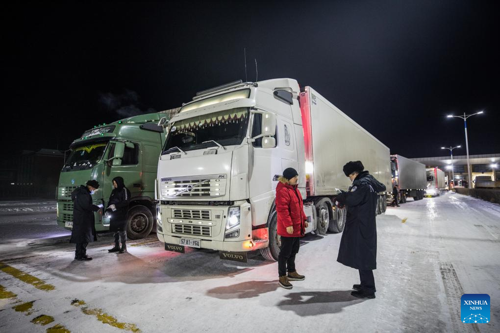 Police officers inspect cargo vehicles at the highway port of Erenhot in north China's Inner Mongolia Autonomous Region, Dec. 16, 2023. (Photo by Guo Pengjie/Xinhua)