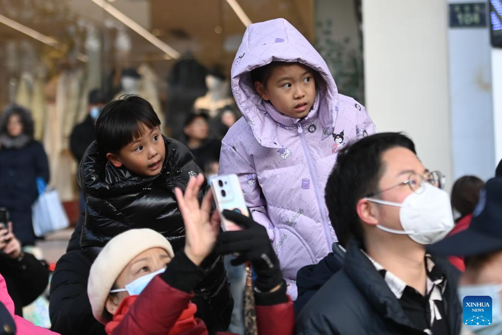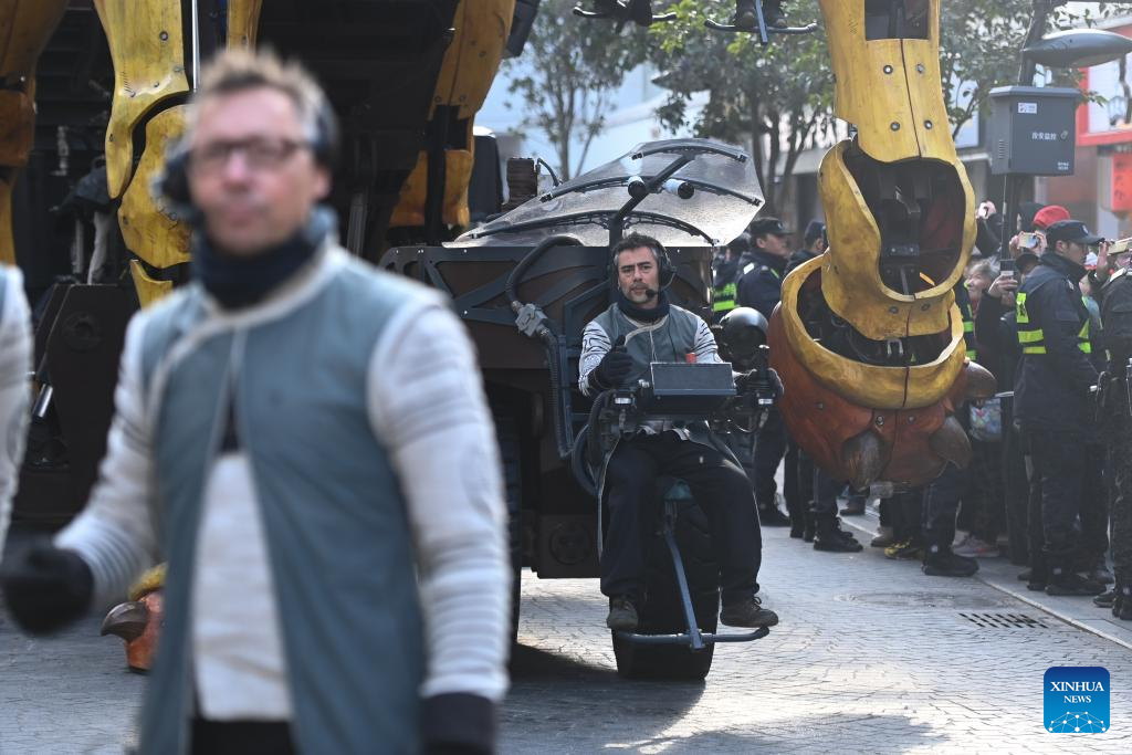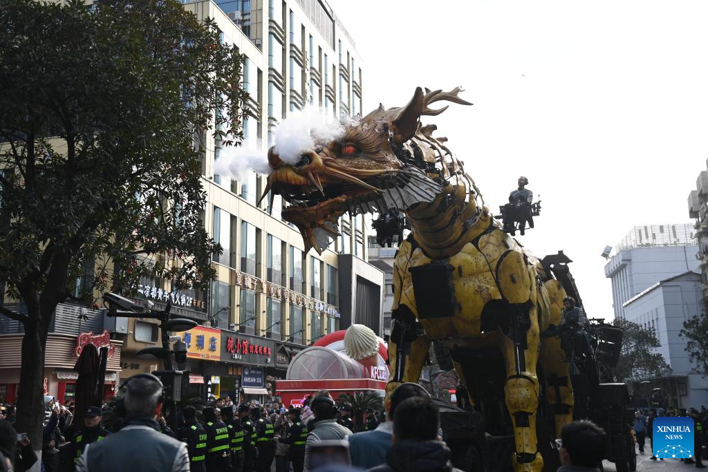 People watch as a mechanical device Horse Dragon Long Ma parades on a street in Gongshu District of Hangzhou, east China's Zhejiang Province, Dec. 16, 2023. The device is made in 2014 by French production company La Machine to celebrate the 50th anniversary of diplomatic relations between France and China. (Xinhua/Huang Zongzhi)