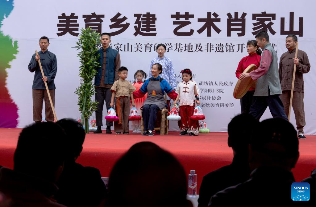 A performance is staged during the opening ceremony of Xiaojiashan aesthetic education research base and an intangible cultural heritage museum in Xiaojiashan Village of Sanming City, southeast China's Fujian Province, Dec. 16, 2023. To utilize its land resources, Xiaojiashan Village has introduced quality academic resources to build an aesthetic education research base. The base will be equipped with an operation team in the future to better fulfill its functions. (Xinhua/Wei Peiquan)