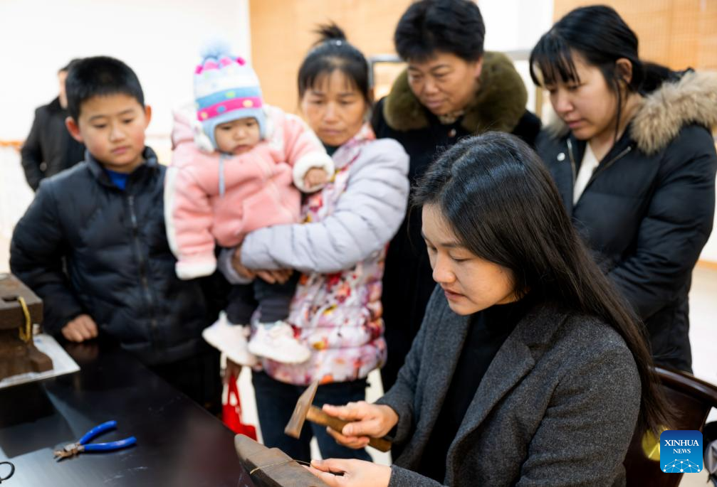 An intangible cultural heritage inheritor demonstrates traditional ceramic mending technique at the Xiaojiashan aesthetic education research base in Xiaojiashan Village of Sanming City, southeast China's Fujian Province, Dec. 16, 2023. To utilize its land resources, Xiaojiashan Village has introduced quality academic resources to build an aesthetic education research base. The base will be equipped with an operation team in the future to better fulfill its functions. (Xinhua/Wei Peiquan)