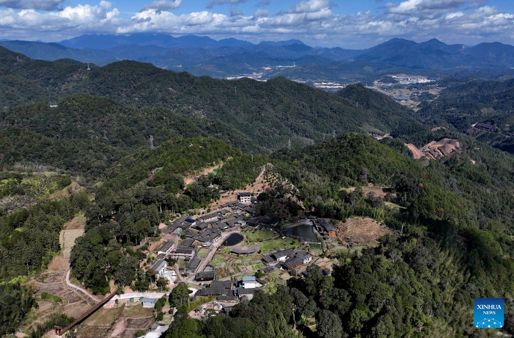 This aerial photo taken on Dec. 15, 2023 shows a view of Xiaojiashan Village in Sanming City, southeast China's Fujian Province. To utilize its land resources, Xiaojiashan Village has introduced quality academic resources to build an aesthetic education research base. The base will be equipped with an operation team in the future to better fulfill its functions. (Xinhua/Wei Peiquan)