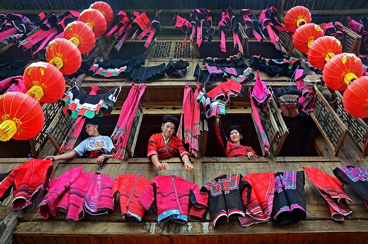 Early in the morning, Red Yao women would open the windows and hang their bright-colored clothes out on drying racks and corridors. Soon, the walls of every house were transformed into a "sea" of vibrant red garments.