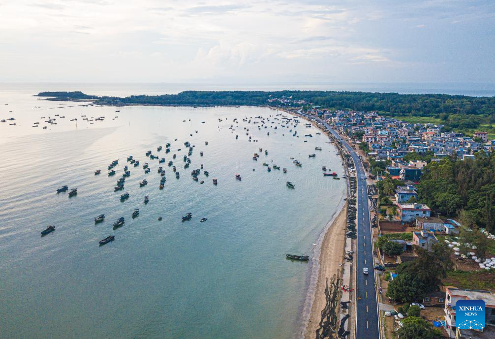 This aerial photo taken on June 25, 2023 shows the scenery along the Hainan coastal highway for sightseeing in Qionghai, south China's Hainan Province. The opening ceremony of the Hainan coastal highway for sightseeing was held in Haikou on Monday. This 988-kilometer ring road connects most bays, capes, specialty townships, scenic spots and resorts along the coast of this island province. (Xinhua/Pu Xiaoxu)
