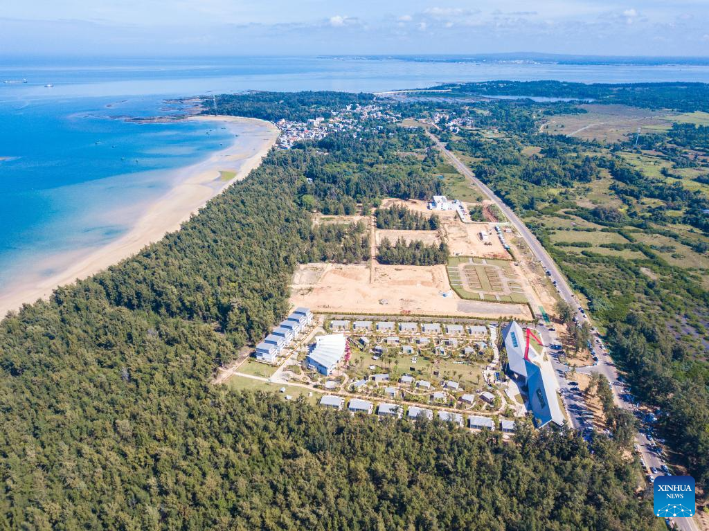 This aerial photo taken on Dec. 15, 2023 shows a resort by the Hainan coastal highway for sightseeing in Danzhou, south China's Hainan Province. The opening ceremony of the Hainan coastal highway for sightseeing was held in Haikou on Monday. This 988-kilometer ring road connects most bays, capes, specialty townships, scenic spots and resorts along the coast of this island province. (Xinhua/Pu Xiaoxu)