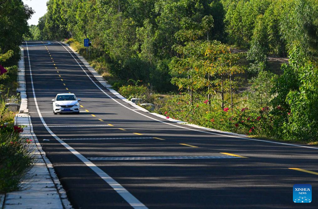 A vehicle is seen on the Hainan coastal highway for sightseeing in Changjiang, south China's Hainan Province, Dec. 10, 2023. The opening ceremony of the Hainan coastal highway for sightseeing was held in Haikou on Monday. This 988-kilometer ring road connects most bays, capes, specialty townships, scenic spots and resorts along the coast of this island province. (Xinhua/Pu Xiaoxu)