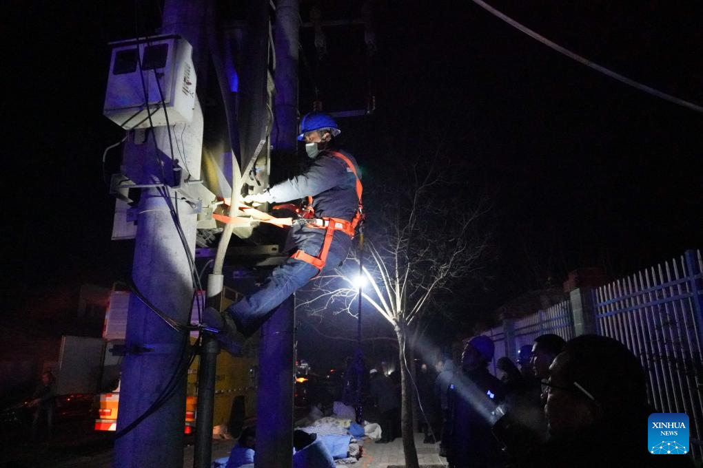 Workers repair power supply facilities outside a hospital in Jishishan Bao'an, Dongxiang, Sala Autonomous County of Linxia Hui Autonomous Prefecture, northwest China's Gansu Province, Dec. 19, 2023. (Xinhua/Ma Xiping)