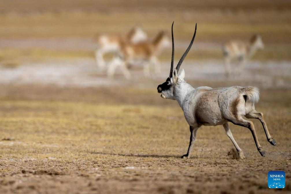 A male Tibetan antelope gallops at the Qiangtang National Nature Reserve in the northern part of southwest China's Xizang Autonomous Region, Dec. 16, 2023. (Xinhua/Jiang Fan)