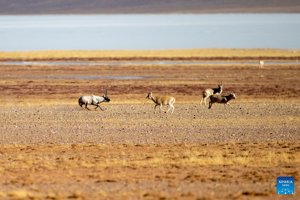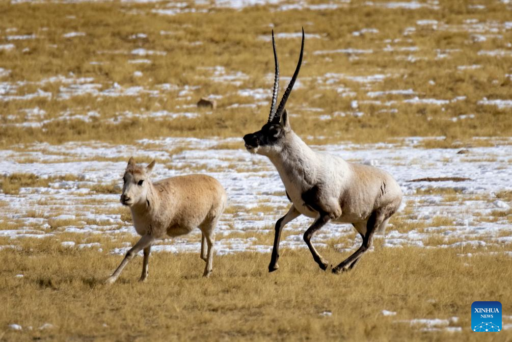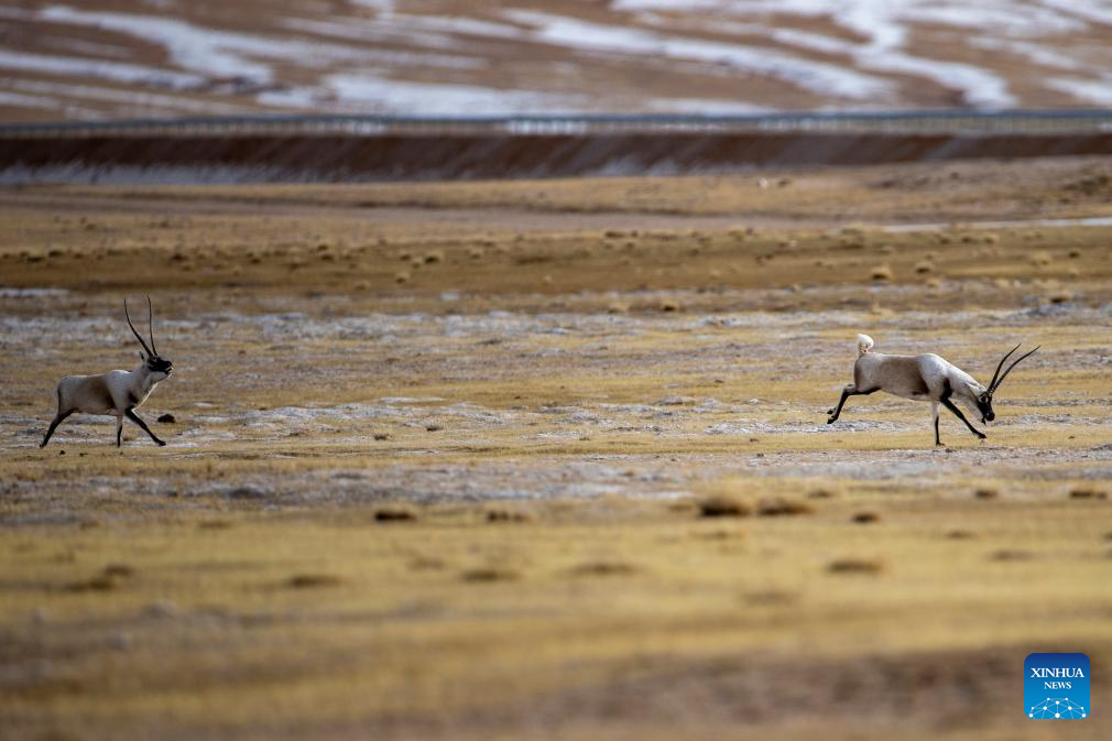 A male Tibetan antelope (1st L) pursues a female one for mating at the Qiangtang National Nature Reserve in the northern part of southwest China's Xizang Autonomous Region, Dec. 17, 2023. (Xinhua/Jiang Fan)
