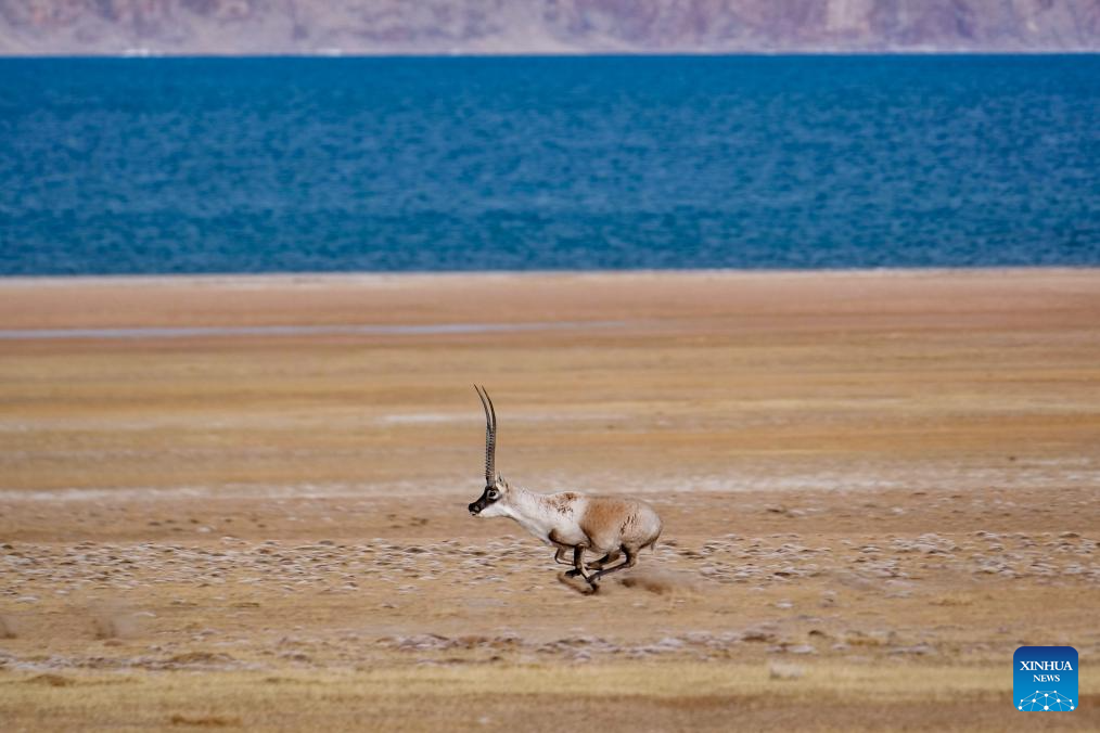 A male Tibetan antelope gallops at the Qiangtang National Nature Reserve in the northern part of southwest China's Xizang Autonomous Region, Dec. 16, 2023. (Photo by Tenzin Norbu/Xinhua)