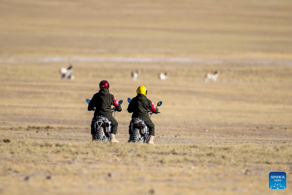 Rangers patrol to monitor Tibetan antelopes at the Qiangtang National Nature Reserve in the northern part of southwest China's Xizang Autonomous Region, Dec. 17, 2023. (Xinhua/Jiang Fan)