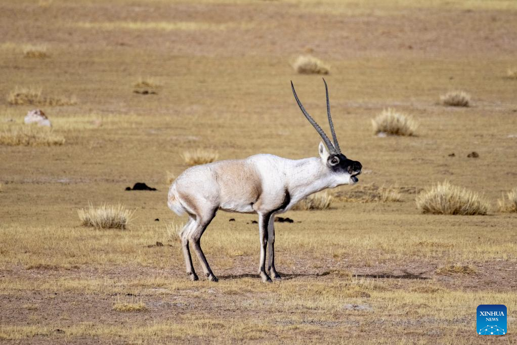 A male Tibetan antelope vocally attracts the female for mating at the Qiangtang National Nature Reserve in the northern part of southwest China's Xizang Autonomous Region, Dec. 16, 2023. (Xinhua/Jiang Fan)