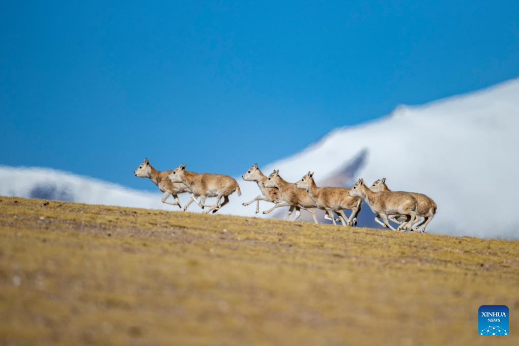 A flock of female Tibetan antelopes gallop at the Qiangtang National Nature Reserve in the northern part of southwest China's Xizang Autonomous Region, Dec. 16, 2023. (Xinhua/Jiang Fan)?