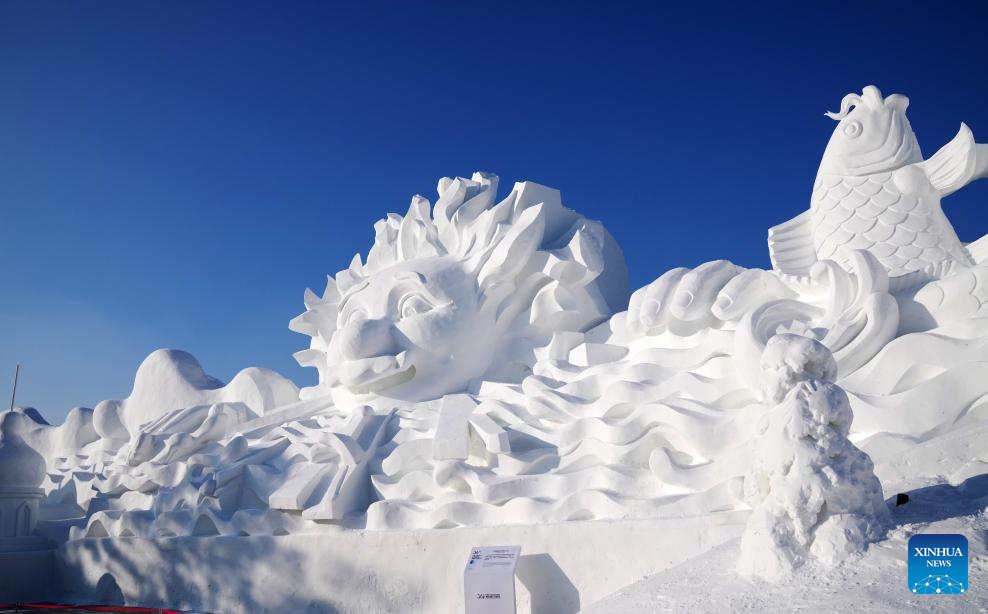 This photo taken on Dec. 19, 2023 shows a giant snow sculpture at the Sun Island scenic area in Harbin, northeast China's Heilongjiang Province. Sculptors have been busy with snow sculpture works for the upcoming 36th Sun Island International Snow Sculpture Expo in Harbin. (Xinhua/Wang Jianwei)