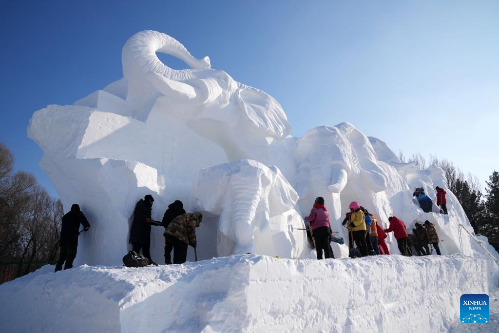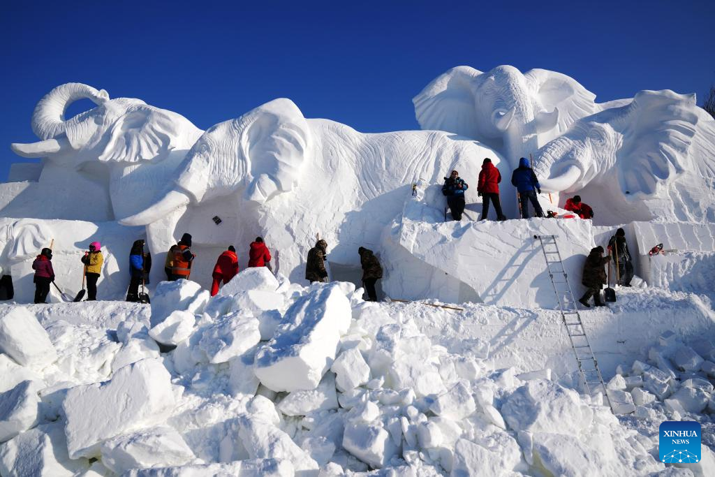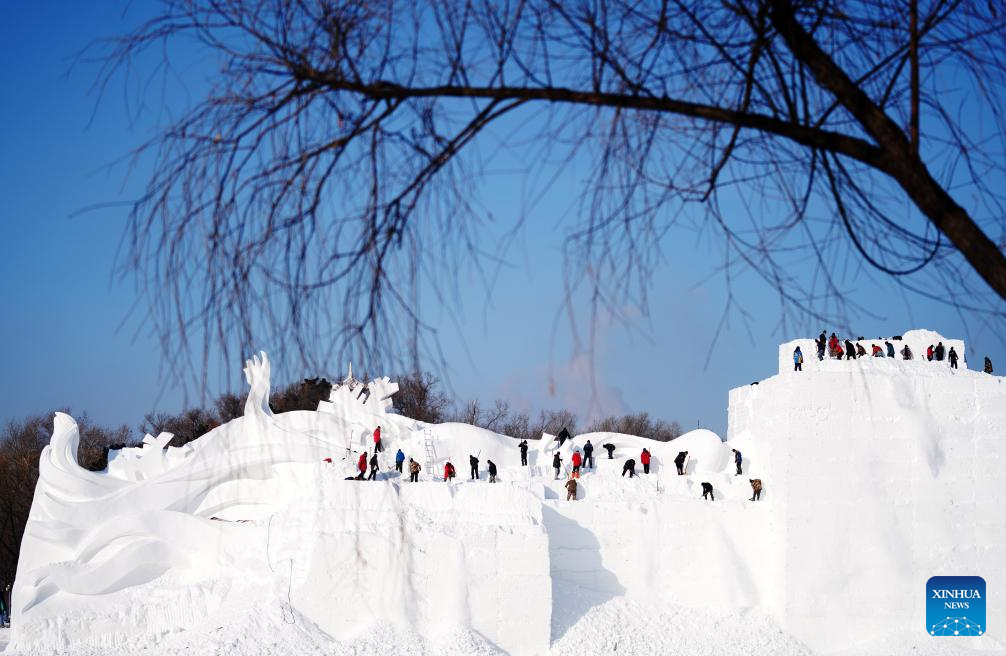 Sculptors work on a giant snow sculpture at the Sun Island scenic area in Harbin, northeast China's Heilongjiang Province, Dec. 19, 2023. Sculptors have been busy with snow sculpture works for the upcoming 36th Sun Island International Snow Sculpture Expo in Harbin. (Xinhua/Wang Jianwei)