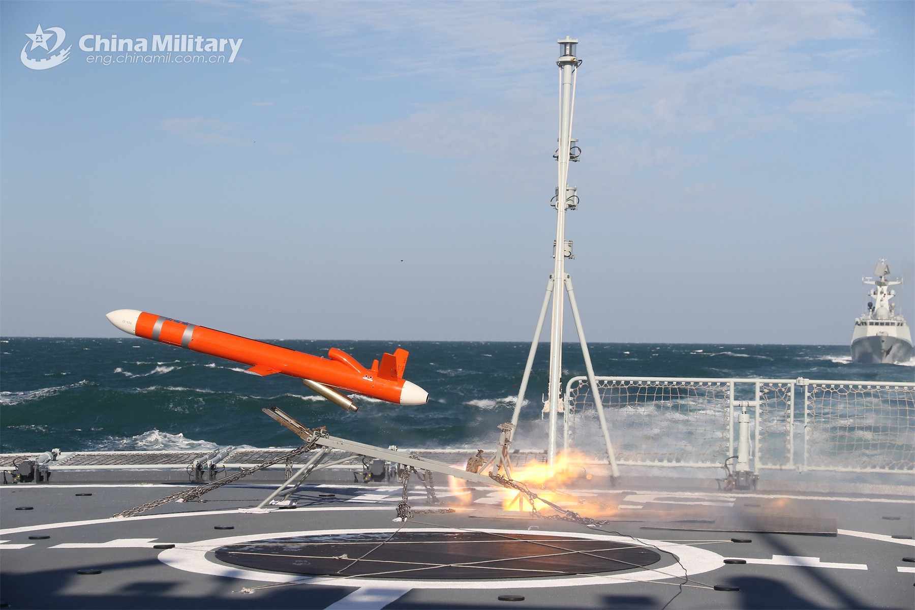 A target drone is launched on the deck of a frigate attached to a naval frigate flotilla under the PLA Eastern Theater Command during the combat training on November 20, 2023. (eng.chinamil.com.cn/Photo by Liu Jia)
