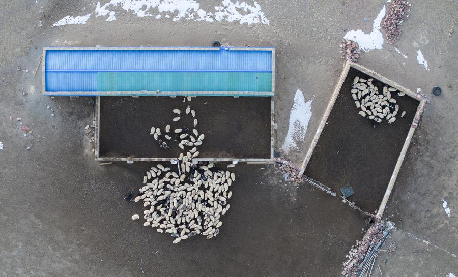 This aerial photo taken on Dec. 18, 2023 shows sheep heading back to shed in Ngoqu Town, Nyima County of Nagqu City, southwest China's Xizang Autonomous Region. (Xinhua/Jiang Fan)