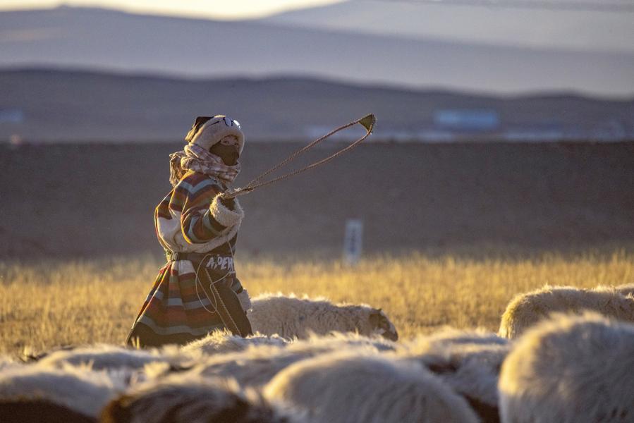 Tenzin drives sheep back to shed in Ngoqu Town, Nyima County of Nagqu City, southwest China's Xizang Autonomous Region, Dec. 18, 2023. (Xinhua/Jiang Fan)