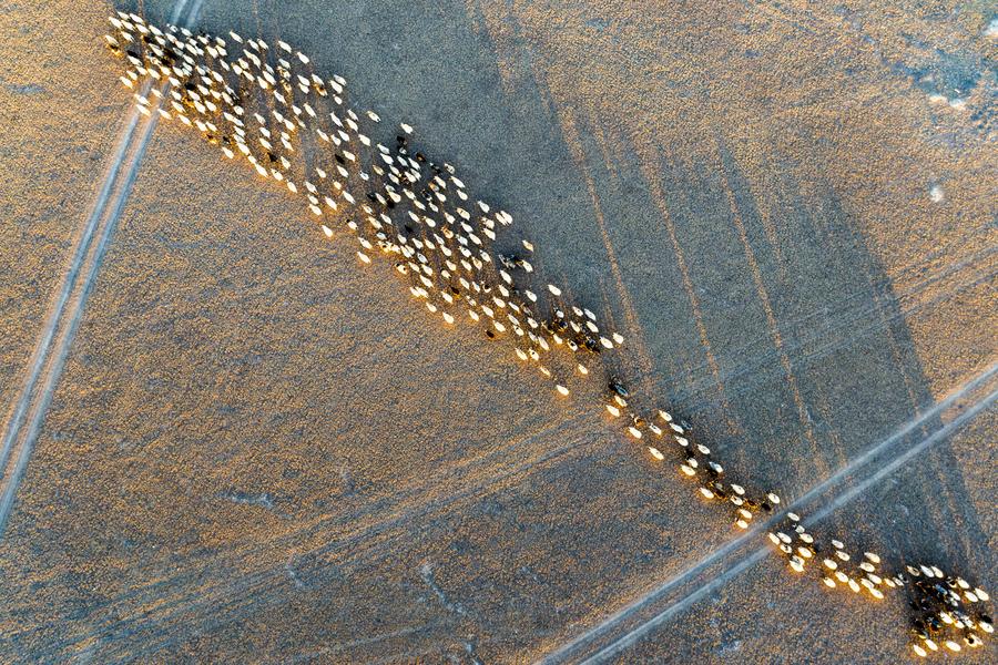 This aerial photo taken on Dec. 18, 2023 shows sheep heading back to shed in Ngoqu Town, Nyima County of Nagqu City, southwest China's Xizang Autonomous Region. (Photo by Tenzin Norbu/Xinhua)