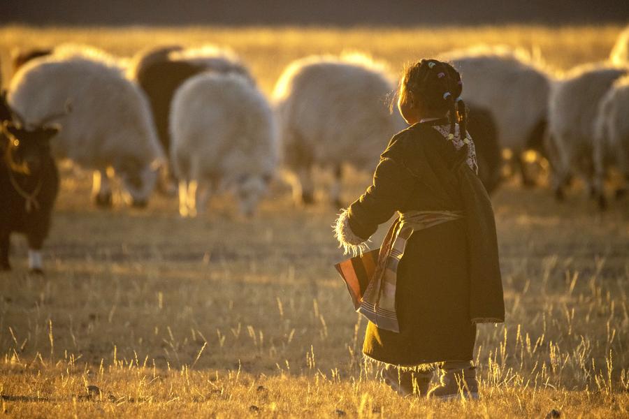 Tenzin's little sister runs towards sheep in Ngoqu Town, Nyima County of Nagqu City, southwest China's Xizang Autonomous Region, Dec. 18, 2023. (Xinhua/Jiang Fan)