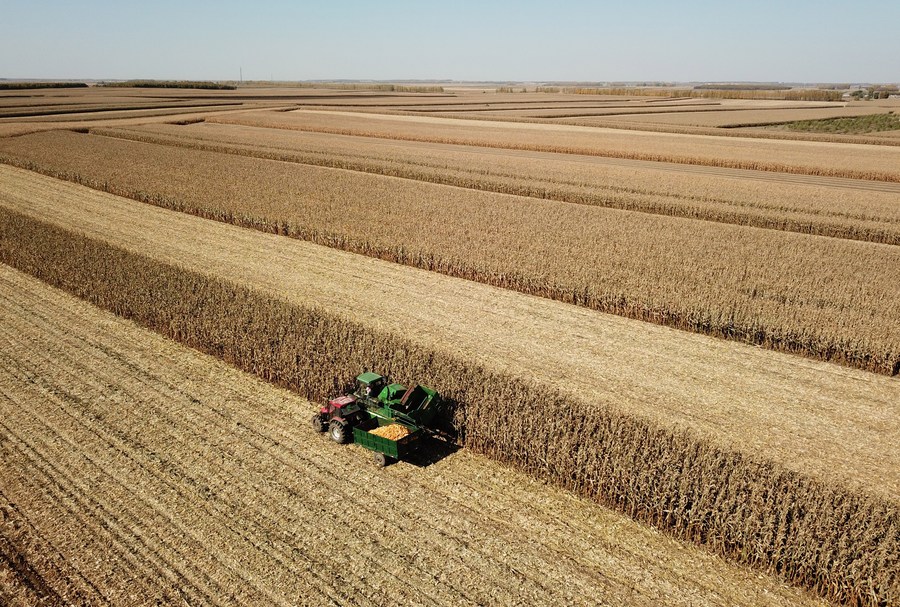 This aerial photo taken on Oct. 11, 2023 shows agricultural machines harvesting corn in Fujin City, northeast China's Heilongjiang Province. (Xinhua/Wang Jianwei)