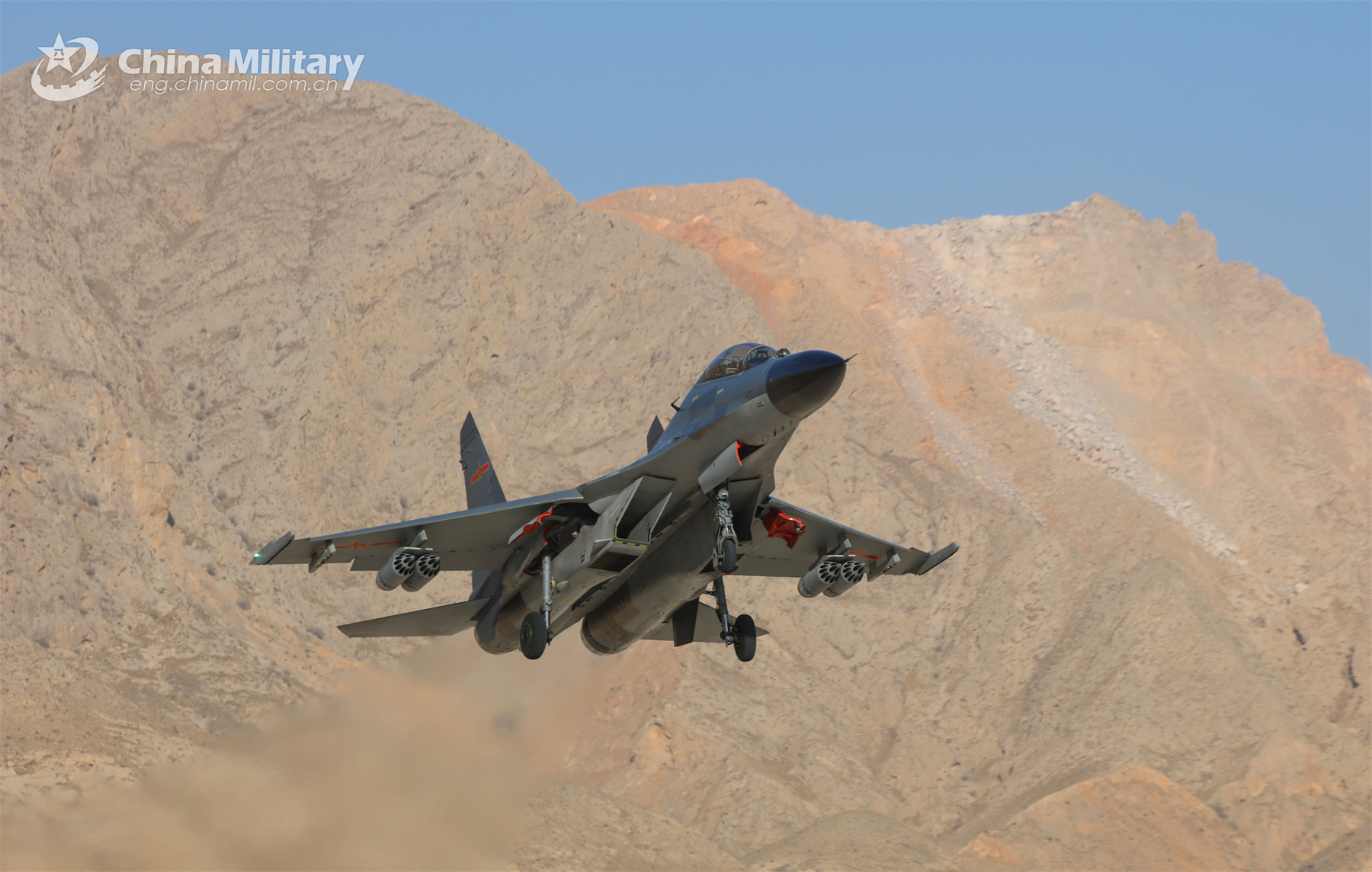 A fighter jet attached to an aviation brigade of the air force under the PLA Western Theater Command soars into the sky during a flight training exercise in early December, 2023. (eng.chinamil.com.cn/Photo by Yu Zeqi)