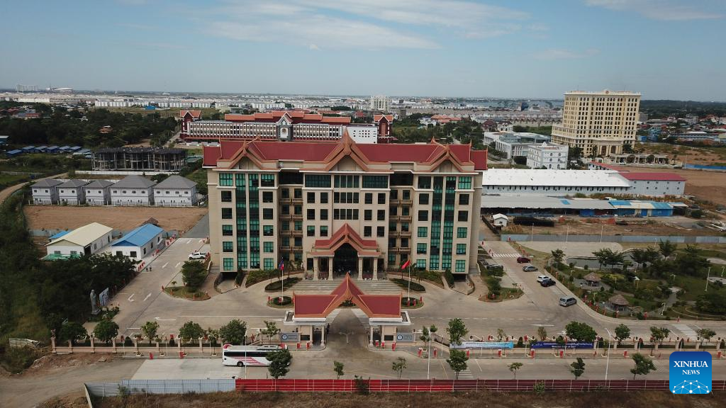 This aerial photo taken on Dec. 20, 2023 shows the campus of the Cambodia-China University of Technology and Science (CamTech) in Phnom Penh, Cambodia. The CamTech was inaugurated here on Wednesday, aiming at providing opportunities for young talents to receive a high level of tertiary education. The university was jointly established by the Federation of Khmer Chinese in Cambodia and Nanjing Vocational University of Industry Technology. (Photo by Van Pov/Xinhua)