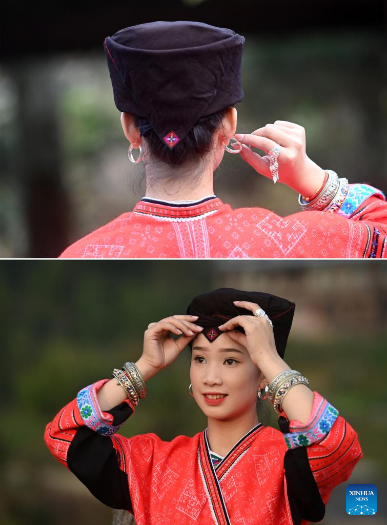 This combo photo taken on Nov. 29, 2023 shows a woman demonstrating folk costumes of Hongyao people in Xiaozhai Village of Longji Town, Longsheng County, south China's Guangxi Zhuang Autonomous Region. (Xinhua/Lu Boan)
