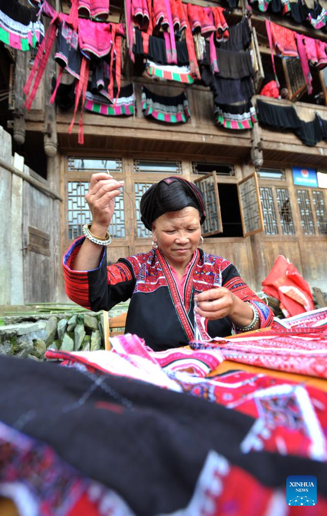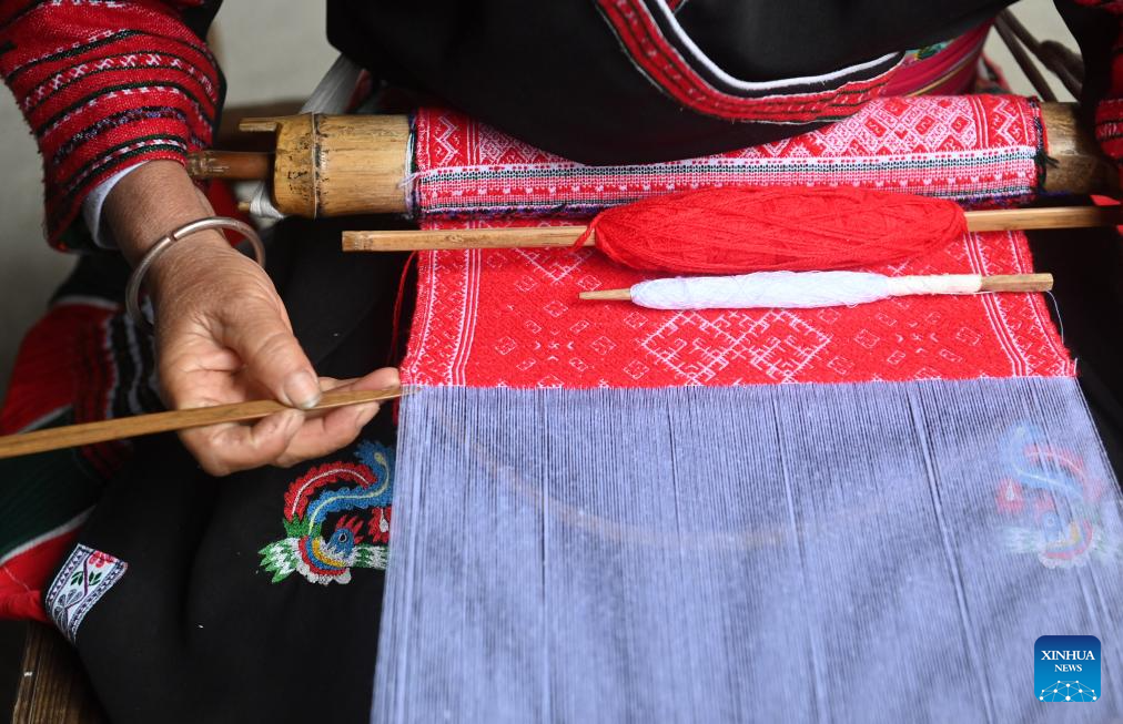A villager weaves cloth to make folk costumes of Hongyao people in Huangluo Village of Longji Town, Longsheng County, south China's Guangxi Zhuang Autonomous Region, Nov. 30, 2023. (Xinhua/Lu Boan)