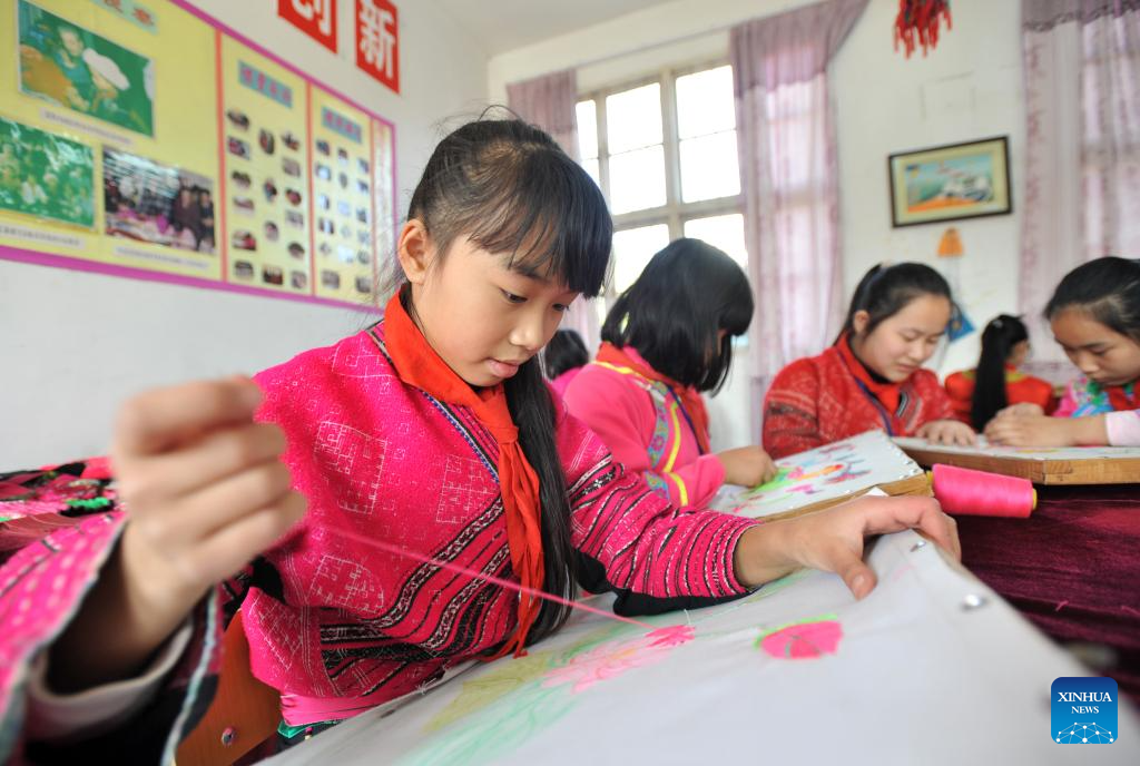 Students learn about embroidery technique of folk costumes of Hongyao people at a school in Sishui Township of Longsheng County, south China's Guangxi Zhuang Autonomous Region, Dec. 5, 2012. (Xinhua/Lu Boan)