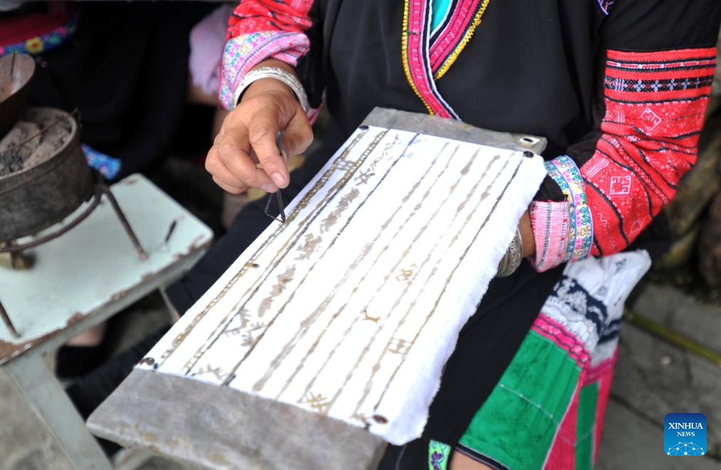 A woman demonstrates wax printing technique of folk costumes of Hongyao people during the "drying clothes" festival in Dazhai Village of Longji Town, Longsheng County, south China's Guangxi Zhuang Autonomous Region, July 2, 2014. (Xinhua/Lu Boan)