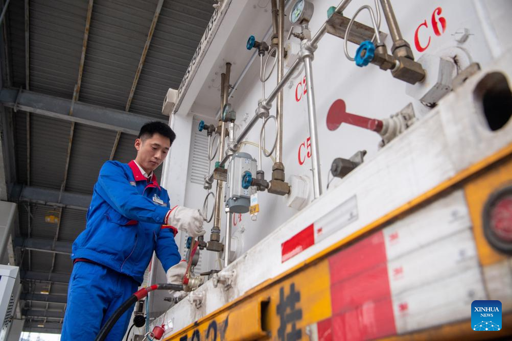 A staff member fuels a hydrogen tube trailer at a hydrogen supply center for hydrogen fuel cell vehicles in Changshou District of southwest China's Chongqing, Dec. 20, 2023. The biggest hydrogen supply center for hydrogen fuel cell vehicles in southwest China came into operation here on Wednesday. (Xinhua/Tang Yi)