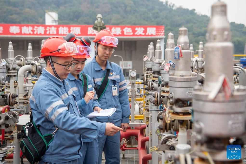 Staff members inspect hydrogen purification devices at a hydrogen supply center for hydrogen fuel cell vehicles in Changshou District of southwest China's Chongqing, Dec. 20, 2023. The biggest hydrogen supply center for hydrogen fuel cell vehicles in southwest China came into operation here on Wednesday. (Xinhua/Tang Yi)