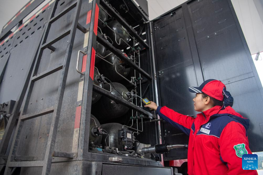 A staff member fuels a logistics heavy-duty truck at a hydrogen supply center for hydrogen fuel cell vehicles in Changshou District of southwest China's Chongqing, Dec. 20, 2023. The biggest hydrogen supply center for hydrogen fuel cell vehicles in southwest China came into operation here on Wednesday. (Xinhua/Tang Yi)