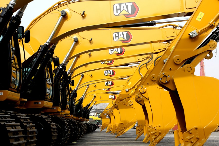 This photo taken on March 15, 2023 shows excavators to be shipped at a port in Lianyungang, east China's Jiangsu Province. (Photo by Wang Chun/Xinhua)