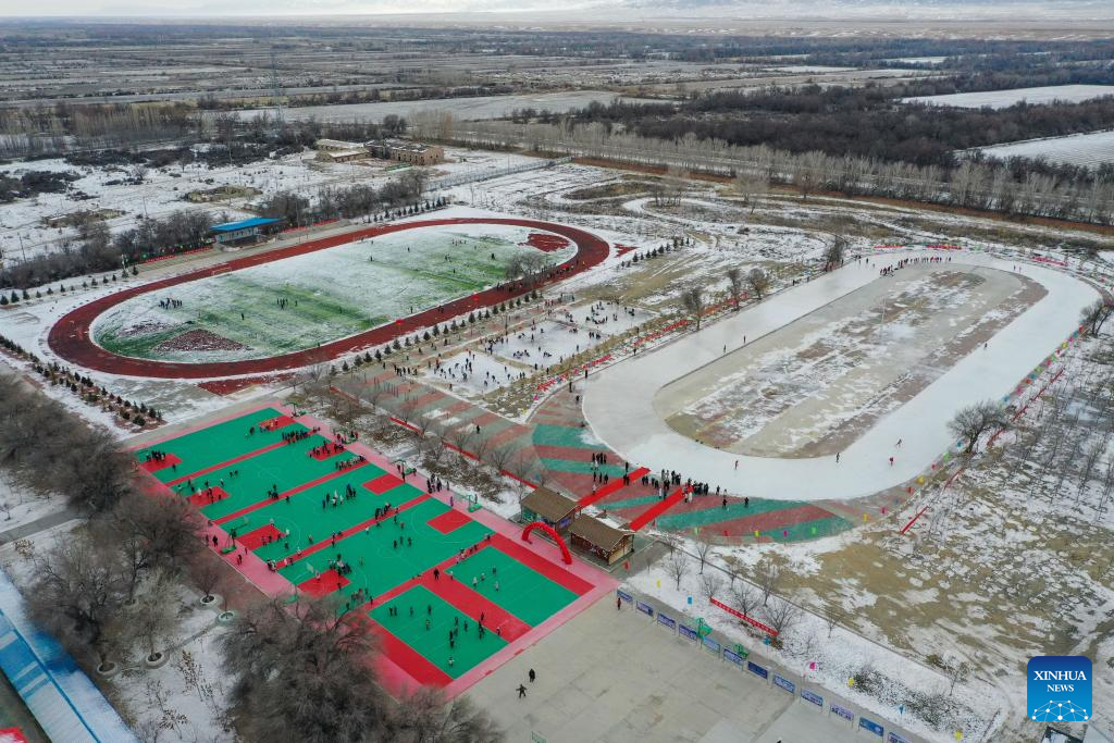 This aerial photo taken on Dec. 20, 2023 shows students taking part in outdoor ice and winter sports at a middle school in Beitun City, northwest China's Xinjiang Uygur Autonomous Region. (Xinhua/Ding Lei)