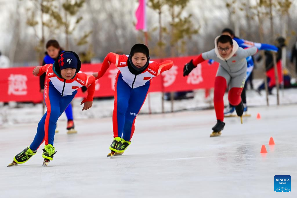 Students practice speed skating at a middle school in Beitun City, northwest China's Xinjiang Uygur Autonomous Region, Dec. 20, 2023. (Xinhua/Ding Lei)