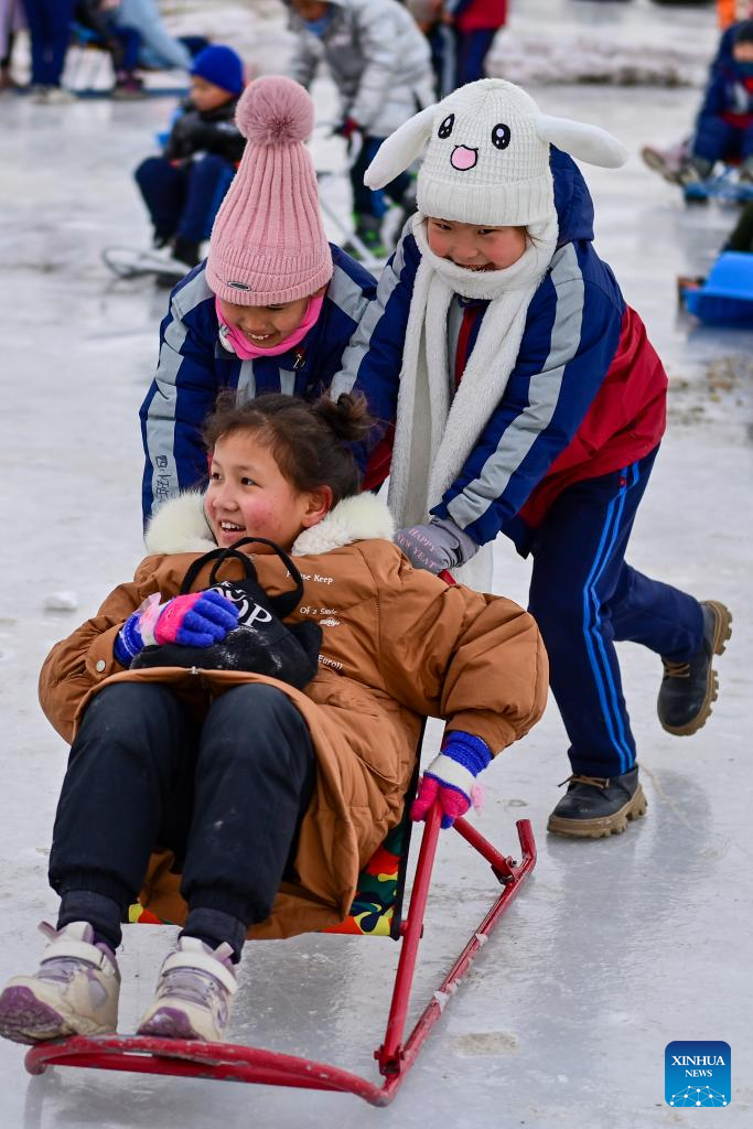Students experience ice-sleigh at a middle school in Beitun City, northwest China's Xinjiang Uygur Autonomous Region, Dec. 20, 2023. (Xinhua/Ding Lei)