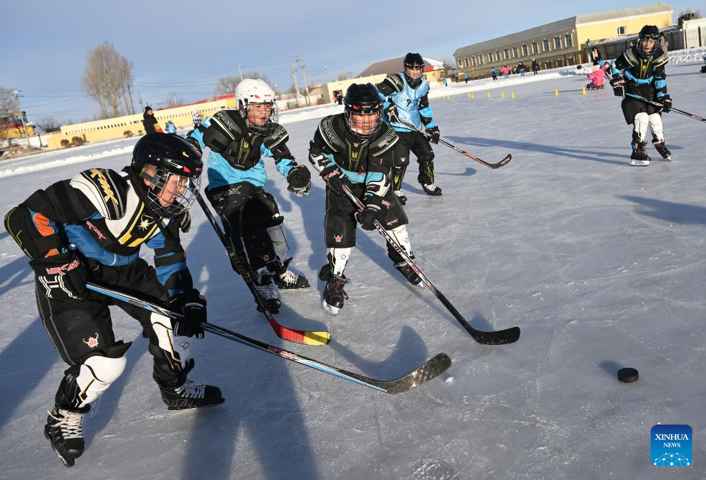 Students of ice hockey team participate in training at the Shuixigou middle school in Urumqi County, northwest China's Xinjiang Uygur Autonomous Region, Dec. 20, 2023. (Xinhua/Li He)