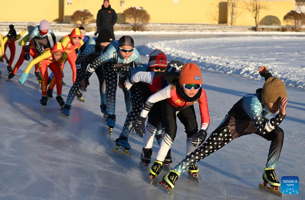 Students take a speed skating course at the Shuixigou middle school in Urumqi County, northwest China's Xinjiang Uygur Autonomous Region, Dec. 20, 2023. (Xinhua/Li He)
