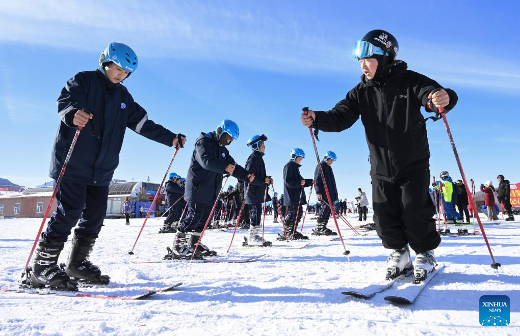 Students of the Miaoergou middle school take a skiing course at a ski resort in Urumqi County, northwest China's Xinjiang Uygur Autonomous Region, Dec. 19, 2023. (Xinhua/Li He)