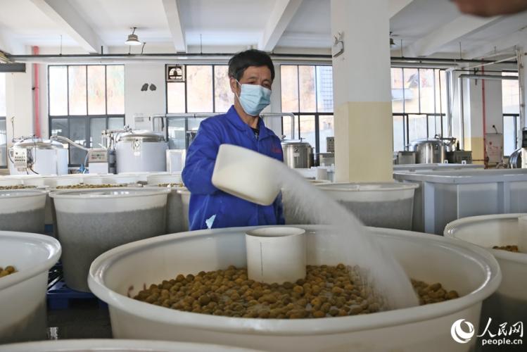 A worker adds sugar to green plums in a sugar-soaking tank at a factory in Yongtai county, southeast China's Fujian Province. (People's Daily Online/Li Changqian)