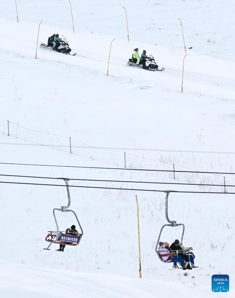 Tourists enjoy snowmobiles and lifts at Narat international ski resort in Xinyuan County, Ili Kazak Autonomous Prefecture, northwest China's Xinjiang Uygur Autonomous Region, Dec. 21, 2023. (Xinhua/Li He)