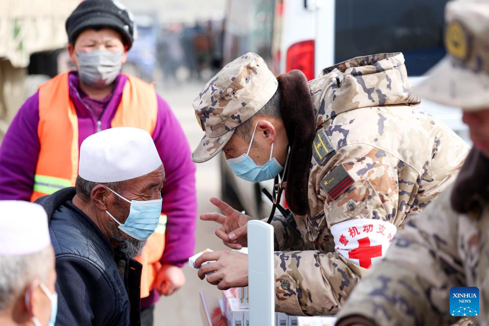A military medic treats a patient in Xiaojia Village of Jishishan County, northwest China's Gansu Province, Dec. 22, 2023. The Chinese People's Liberation Army (PLA) and the People's Armed Police Force (PAPF) have deployed multiple rescue forces to quake-hit areas in response to a 6.2-magnitude earthquake that jolted northwest China's Gansu Province late Monday. (Photo by Hou Chonghui/Xinhua)