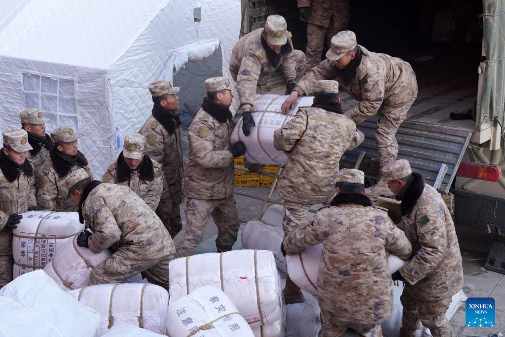 Soldiers unload disaster relief materials in Xiaojia Village of Jishishan County, northwest China's Gansu Province, Dec. 22, 2023. The Chinese People's Liberation Army (PLA) and the People's Armed Police Force (PAPF) have deployed multiple rescue forces to quake-hit areas in response to a 6.2-magnitude earthquake that jolted northwest China's Gansu Province late Monday. (Photo by Hou Chonghui/Xinhua)