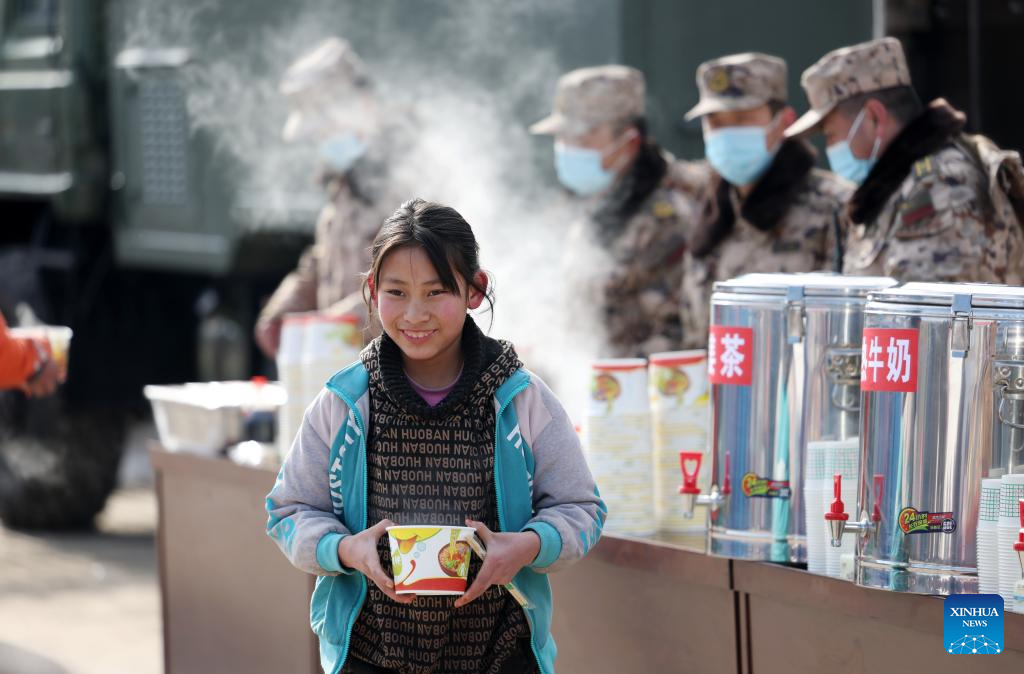 A girl holds a bowl of dumplings distributed by soldiers in Xiaojia Village of Jishishan County, northwest China's Gansu Province, Dec. 22, 2023. The Chinese People's Liberation Army (PLA) and the People's Armed Police Force (PAPF) have deployed multiple rescue forces to quake-hit areas in response to a 6.2-magnitude earthquake that jolted northwest China's Gansu Province late Monday. (Photo by Hou Chonghui/Xinhua)